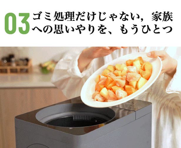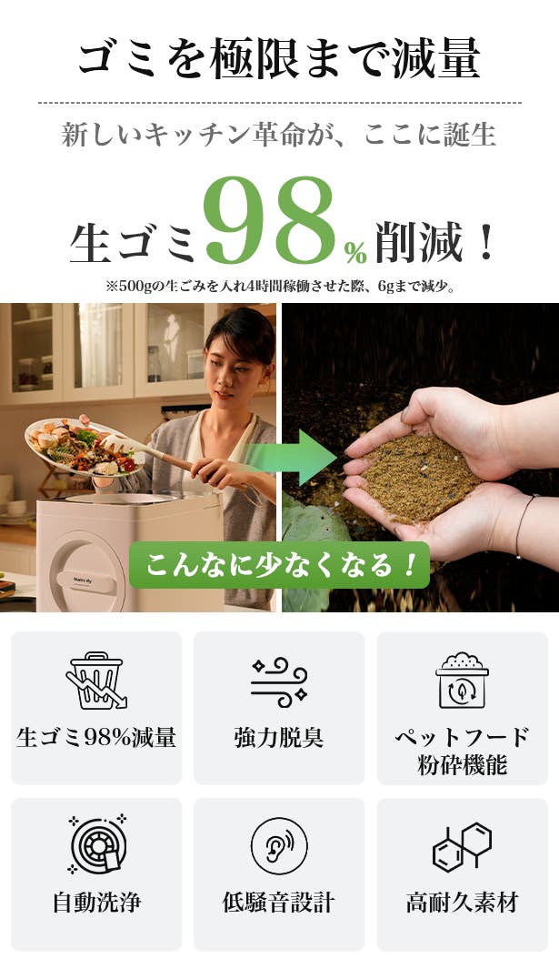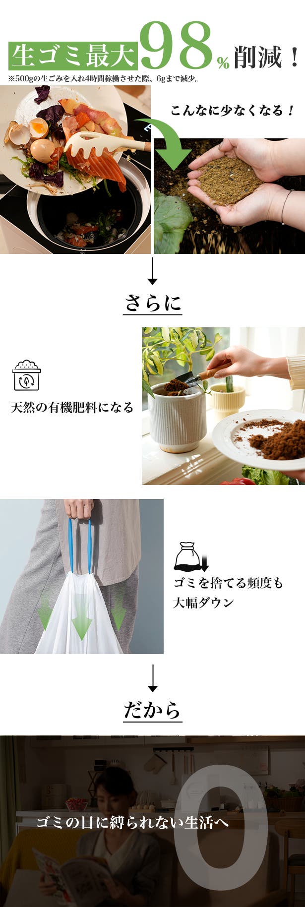 - ワンボタンで乾燥、脱臭、生ゴミを肥料に変えられる。