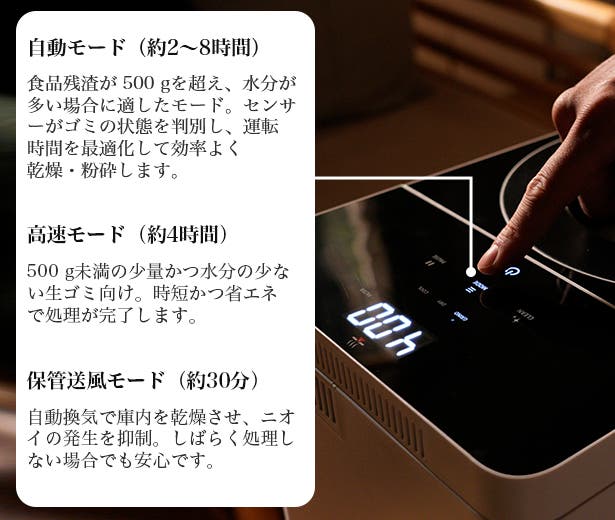 生ゴミの量や状態に合わせて、最適な処理をかんたん選択。モードボタンを押すだけで自動切替。3秒後に運転開始。