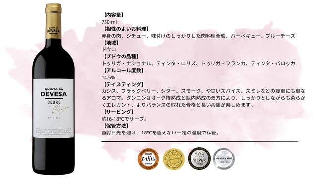 スミレと黒い果実のアロマが特徴的なキンタ・ダ・デヴェサ赤は、典型的なドウロの赤ワインの特徴が楽しめます。フルボディで、強いタンニンと高い酸味があり、赤身の肉、特に焼き肉に非常によく合います。洋風のバーベキュースタイルなら、骨付き牛肉やリブロース・ビーフ、和風では典型的な焼き肉に合うように、いずれもデヴェサ赤のしっかりとしたタンニンが、焼き肉の噛み応えや風味と見事に調和します。