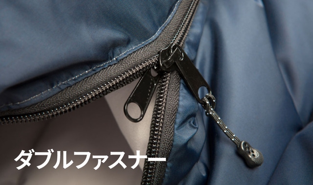寝袋の内側、外側両方でファスナーを開閉できるダブルファスナー使用。