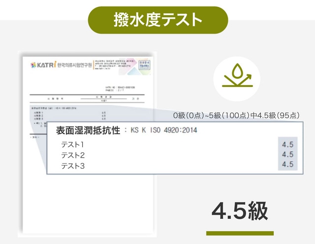 オールインワン寝袋布団は公認された機関を通じて撥水度テストを行い、4.5等級の高い撥水度が確認されました。