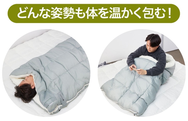 お家、キャンプ、車中泊のどこでもファスナーを上げると体を包む寝袋に大変身!