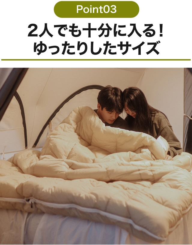 200cm×160cmのワイドサイズは大柄の方でもゆったり寝返りを打つなどの身動きが楽にでき、小さなお子様なら親子で一緒に寝られるワイド寝袋です。