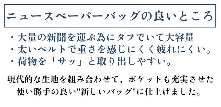 重たくてかさばる大量の新聞紙を持ち運ぶことに特化し誕生したバッグ。