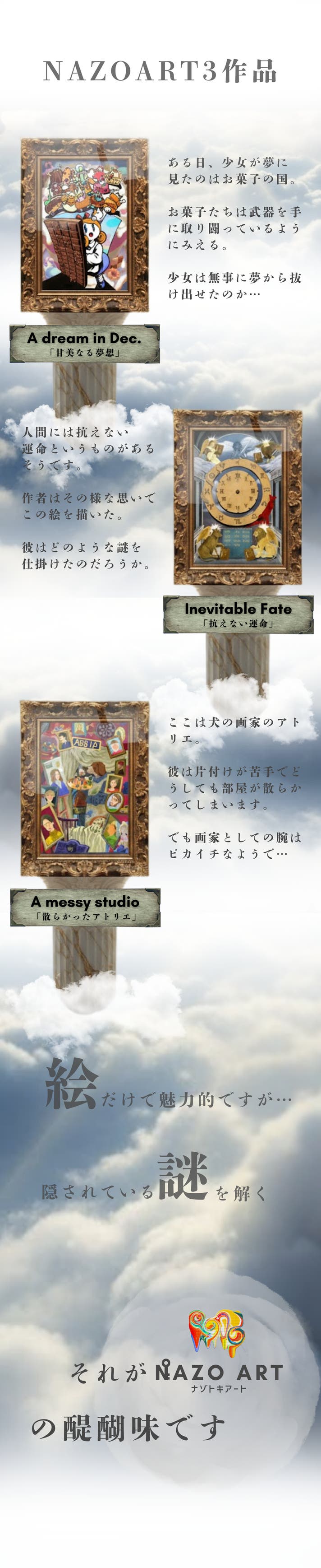 NAZOART「A dream in Dec.」「Inevitable fate」「A messy studio」をお届けします。