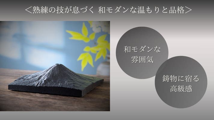 平素、産業機械向けに部品等の製造販売をしておりますが、1560年創業の鋳物の技で生活・文化用品(民生品)を手掛けることにより、皆さんの生活に少しでも豊かな時間を届けられればと製品を企画しました。