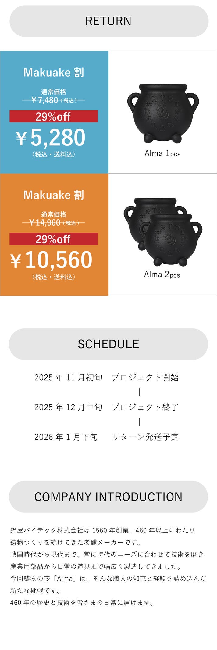 【配送遅延とキャンセルについて】 本文中に記載させていただいたスケジュールは、あくまでプロジェクト公開時点の予定です。応援購入の性質上、配送遅延のおそれがございます。原則として、配送遅延に伴う応援購入のキャンセルはできませんが、リターン配送予定月から 3ヶ月 を超えた場合には、希望者に限りキャンセルにて対応させていただきます。 【商品等の不具合による返品・交換】 原則として、サポーター都合によるキャンセル・返金は承っておりません。 (サポーター都合のキャンセル不可の例:サイズが合わない、誤注文、長期不在) ◾️対応条件: 商品の初期不良、またはお届けした商品がご注文内容と異なる場合、到着後14日以内にプロジェクトページの「実行者にメッセージ」よりご連絡ください。状況を確認の上、返金対応、または良品との交換対応をさせていただきます。 ◾️返金額: リターン金額(税込)の全額 ◾️返品送料/再送料: 実行者負担 【返品・交換をお受けできない商品】 ・サポーターの責任により破損、汚損が生じた商品 ・事前にご連絡をいただいていない商品 ・商品到着後、15日以上経過した商品