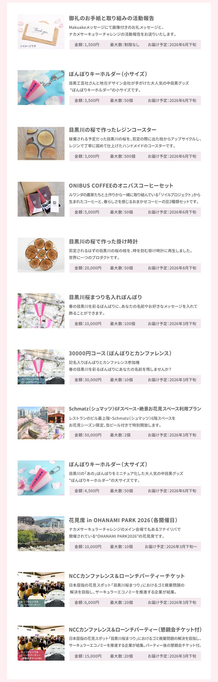 さらに、春の目黒川を彩るあなただけの名入れぼんぼり や、目黒川の桜を一望できるお花見スペース 、地元で人気のONIBUS COFFEEによる特別なコーヒーセット など、中目黒ならではの魅力が詰まったリターンで皆様をお迎えします。