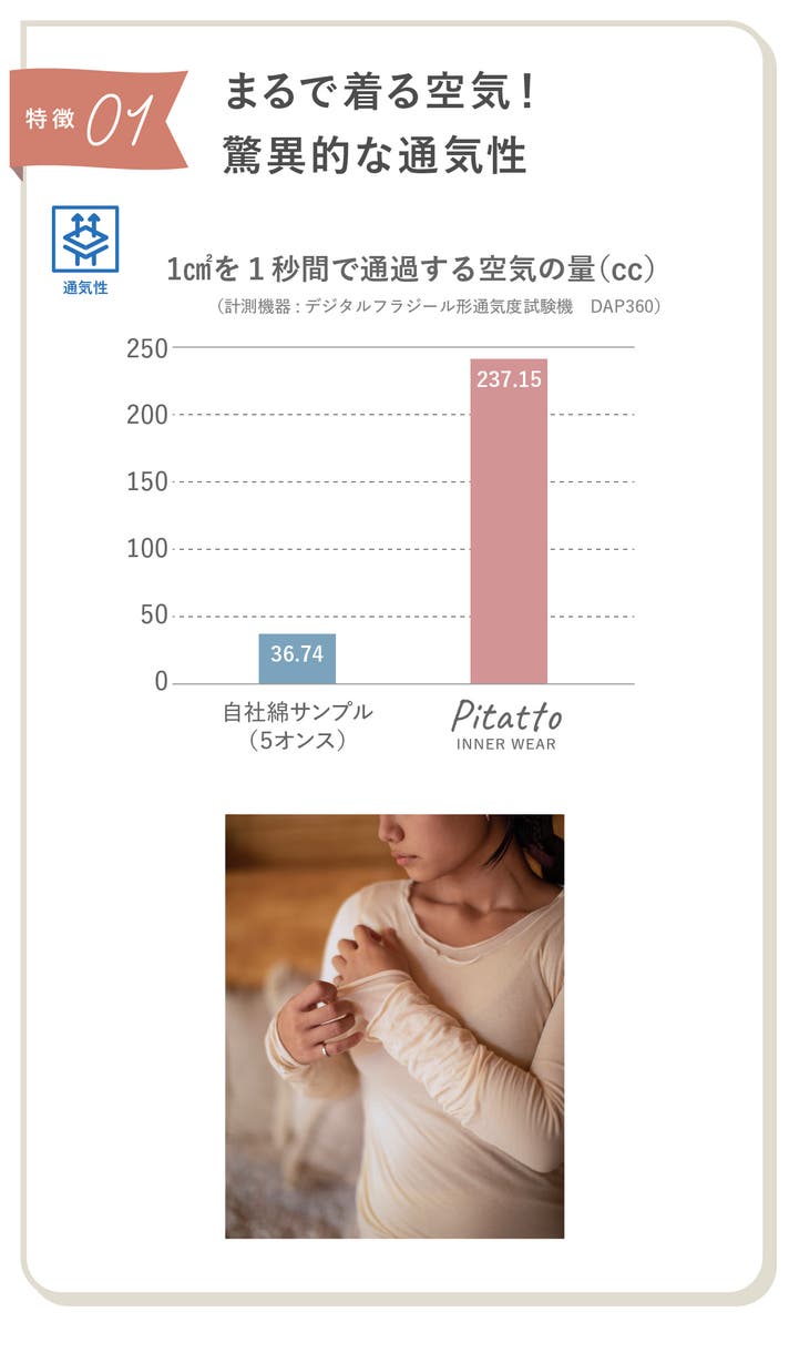 PITATTOの空気を通す力は、自社綿素材サンプル比で約6倍!