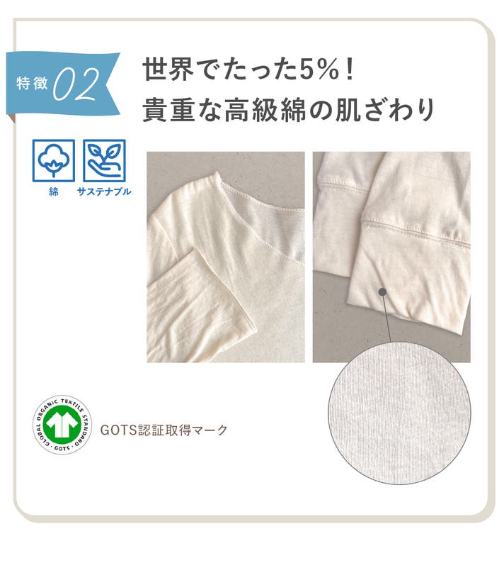 世界でわずか5%しかない希少な「超長綿」、その中でも有機栽培された上質なペルー産ピマコットンを使用しています。