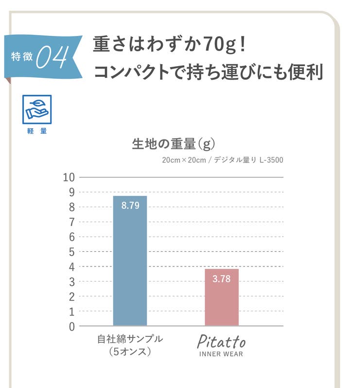 自社の綿素材と比べても、重さは半分以下の軽やかさです。
