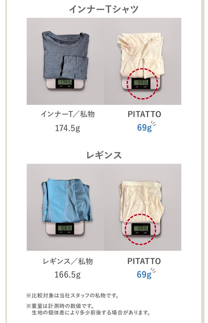 長袖のインナーTシャツとレギンスは、どちらのアイテムも約70g。