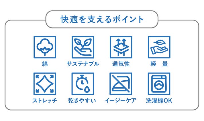 ムレを防ぎ、汗をかいても外気との自然な交換が促されるため、サラサラで気持ちの良い質感が続きます。
