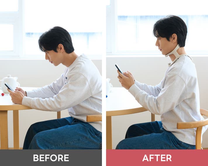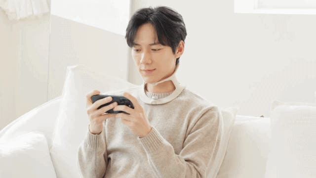 スマートフォン使用時など、下を向く姿勢にも対応し、首まわりにフィットしながらやさしく支える設計です。