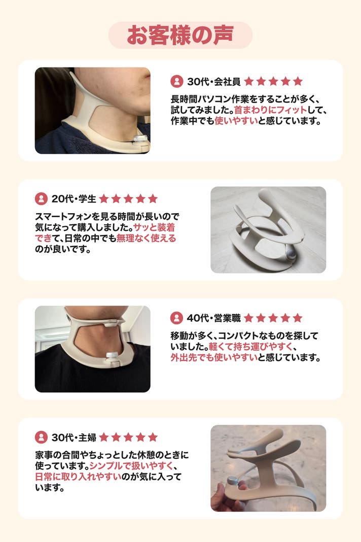 この商品を輸入しようと思った理由:長時間のデスクワークやスマートフォンの使用など、首まわりに負担を感じやすい生活環境は日本でも同様です。「日常の中で使いやすいアイテムがあれば」という想いから、軽さ・使いやすさ・シンプルさ・快適さに魅力を感じ、本製品を日本に紹介したいと考えました。