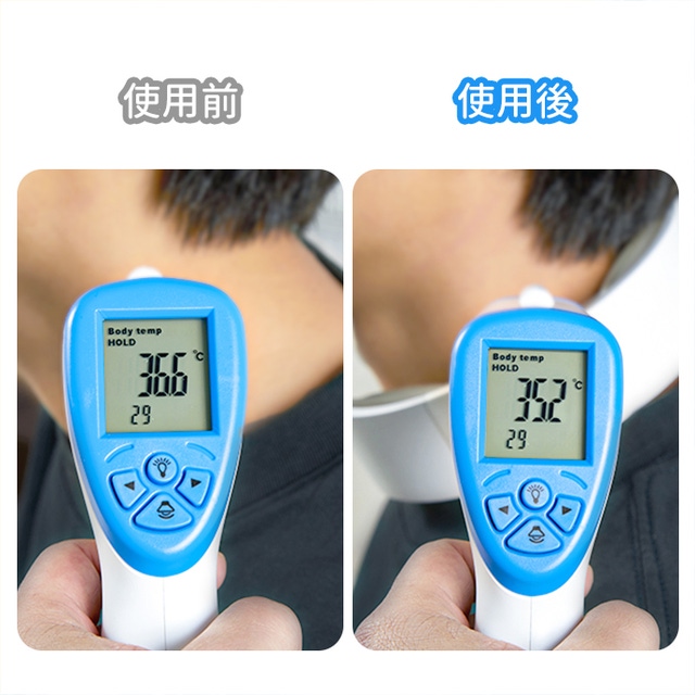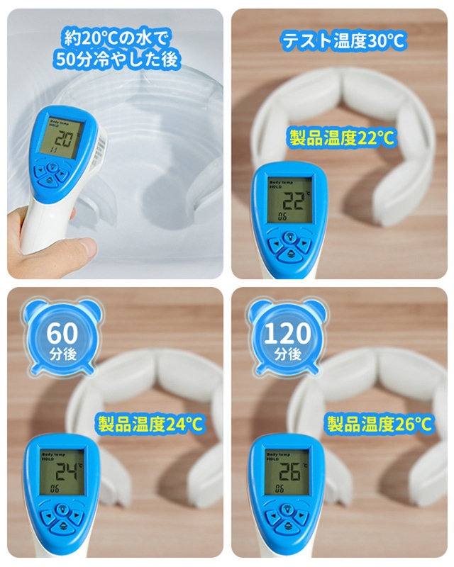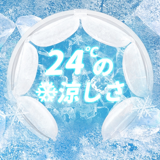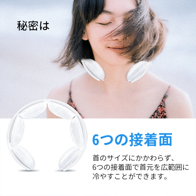 6つの接着面が首回りにしっかりとフィットし、360度涼しさを保つことができます。屋外の環境下で、体温より−12℃の24℃の涼しさが約80分間続きます。