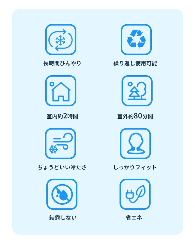冷凍庫に保存すれば、出掛ける時にちょうど良い冷たさで首に掛けることができます。冷たすぎる刺激はなく、ひんやりした気持ちよさが室内で約2時間続きます。