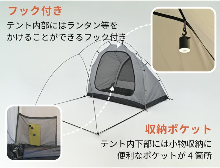 インナーテントにはランタンフックと小物入れに便利なポケットを4つ装備。