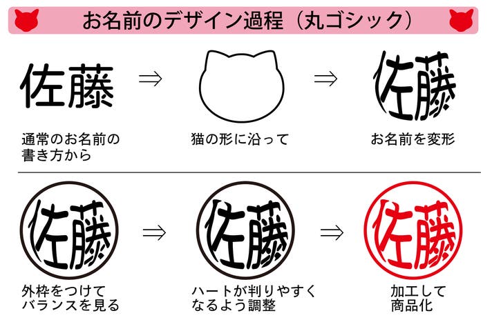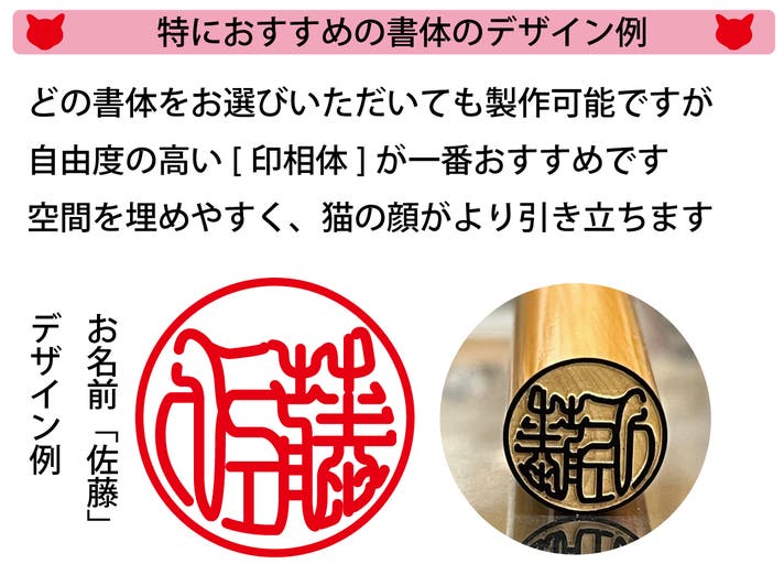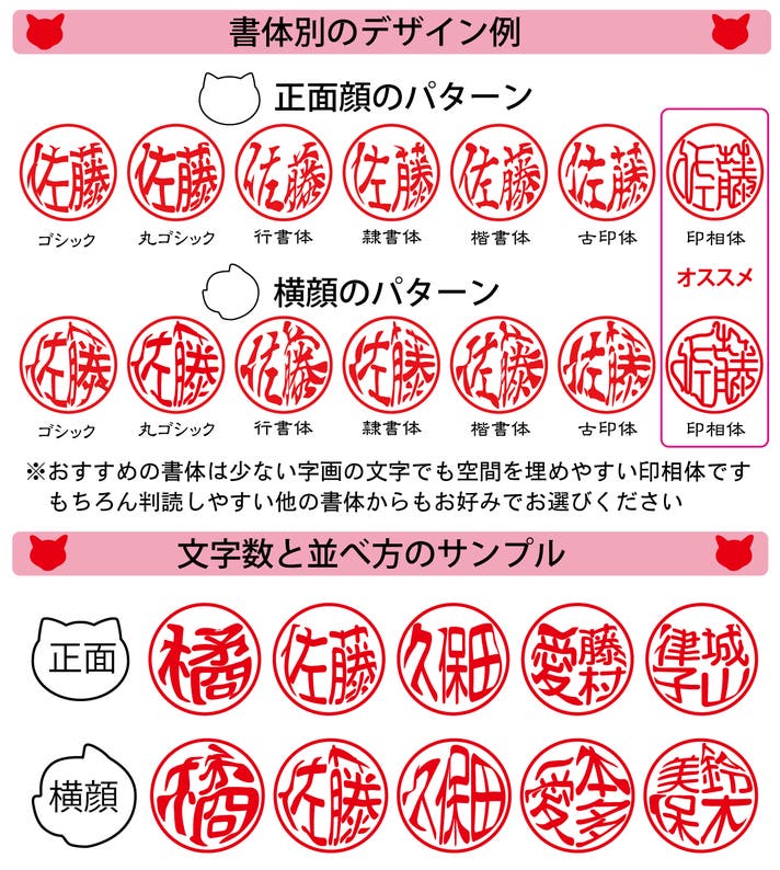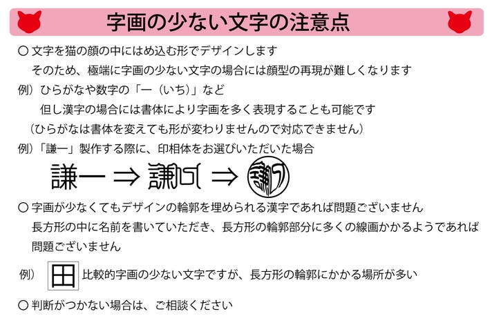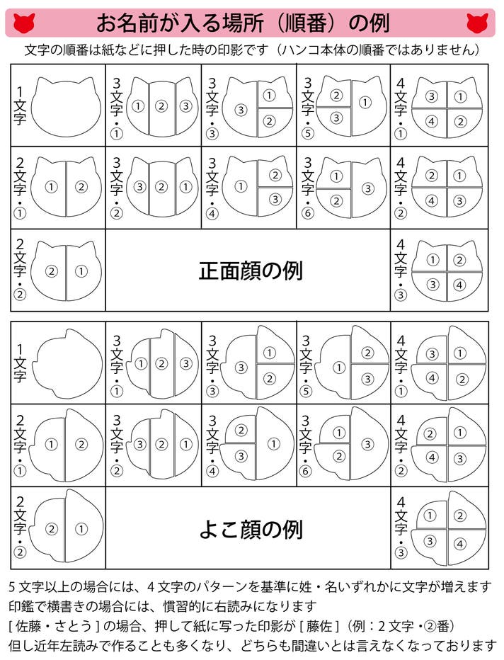 - お名前全体の形を猫の顔(正面・横顔の2パターン)に収め、自然なデザインに仕上げます