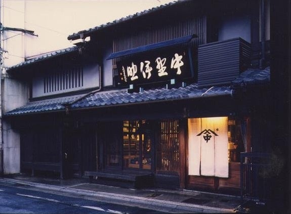 当店がございます京極町(寺町通松原上ル)は、平安京の五条大路東 京極大路にあたり、平安時代末には歌人・藤原俊成(高名な元公家 冷泉家の祖先にあたる『新古今和歌集』や『小倉百人一首』の選者で、この歌集で歌われている「来ぬ人を 松帆の浦の夕なぎに 焼くや藻塩の身もこがれつつ」の作者で著名な藤原定家の父君である。)の邸宅がありました。『平家物語』や謡曲『俊成忠度』には平家が都落ちするとき、引き返して来た平忠度が俊成の家を訪ね、自作の歌「楽浪や志賀の都は荒れにしを昔ながらの山桜かな」を託し、俊成はこの歌を詠み人知らずとして『千載和歌集』に入集したことが語られています。