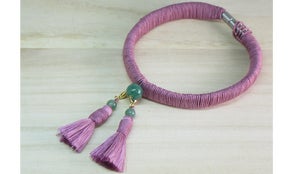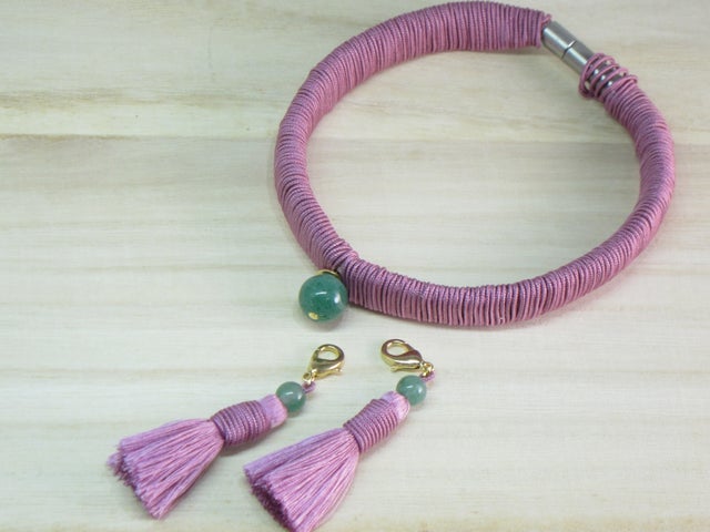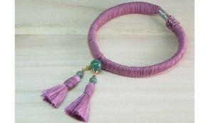 念珠(珠数)の製法と取り入れた首輪です。正絹(シルク)の紐をハンドメイドで合成皮革に巻き付けています。「巻く」という作業は「言うは易し、行うは難し」で慣れないと寄れたりしてまっすぐ巻くのは難しい作業です。そこで時間をかけ職人が丁寧に巻き付けています。また房部分も正絹(シルク)で念珠(珠数)の房と同様に作られる「切房」を使用しました。細い糸でしなやかに、まるで風になびくような軽やかさが特徴で、もし房先がよれてきても「湯のし」という薬缶でお湯を沸かす際にでる蒸気に房先を当て(湯気でやけどしないよう注意が必要)、濡れて暖かい状態のときに軽く指でまっすぐ引き延ばすようにすることで元の房先状態に戻ります。その房部分についているのがパワーストーンのひとつ緑色の玉「アベンチュリンクォーツ」です。その言葉は「健康」を意味し、身に付ける「猫」ちゃんの「健康」を祈念しています。金具には安全パーツを使用し、負荷がかかると外れるようになってます。「猫」ちゃんが飛び降りた際、何かに引っ掛けると怖いのでこのパーツを使用しています。(注・ある程度の負荷がかからないと外れません)