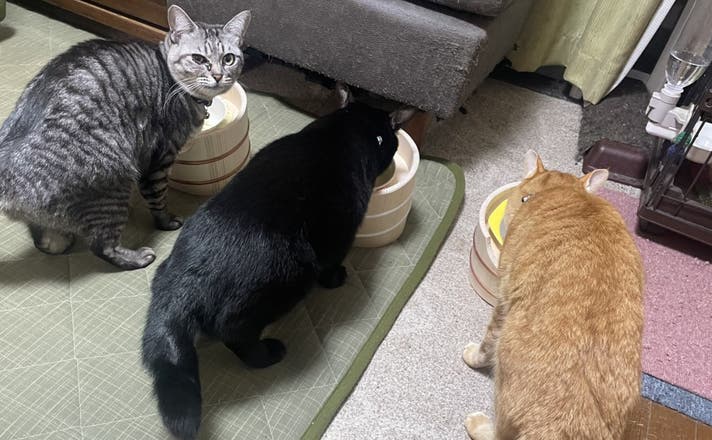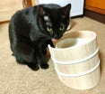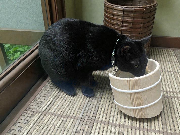 ある日、お風呂場に遊びに来たねこちゃんが、桶に溜まったお水を少し高い姿勢で、とても楽そうに飲んでいる姿を見ました。