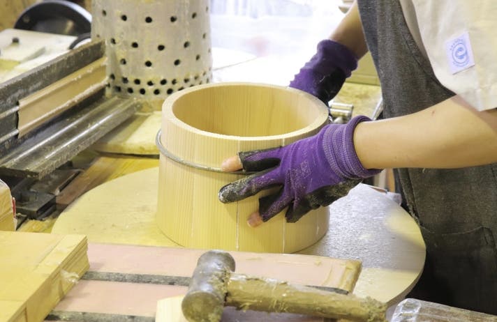 長年の桶樽を製造する技術で培った伝統的な方法で組み立てており、金具や釘を使用せずとも頑丈に仕上げています。