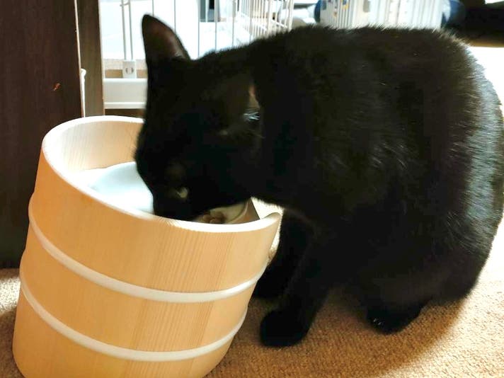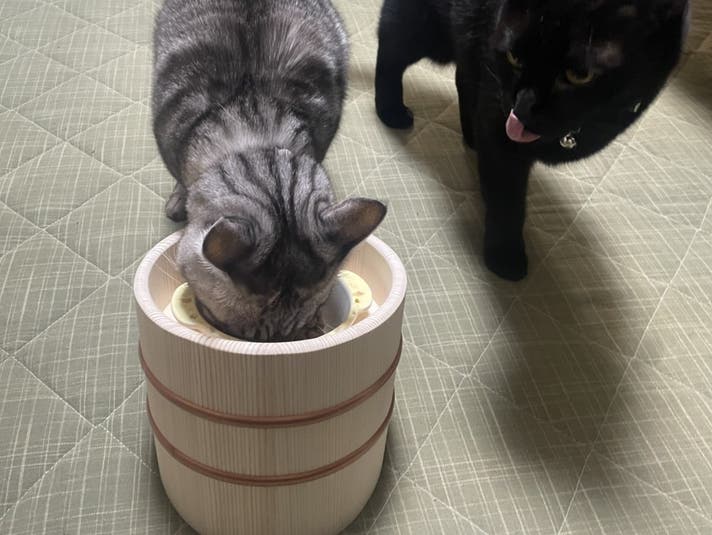 そして、桶樽屋として長年培ってきた木工技術を活かし、水もごはんも、ねこが自然な姿勢で楽しめる天然木の食器台「ねこ樽お膳」が完成しました。