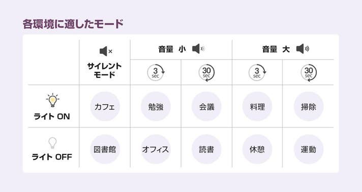 ライトアラームやサイレントモードも搭載しているので、図書館・会議中など音を出せない環境でも安心して使えます。