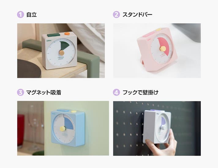 シーンに合わせたアラーム設定・マグネットやフックによる壁面設置など、多彩な使い方が可能です。