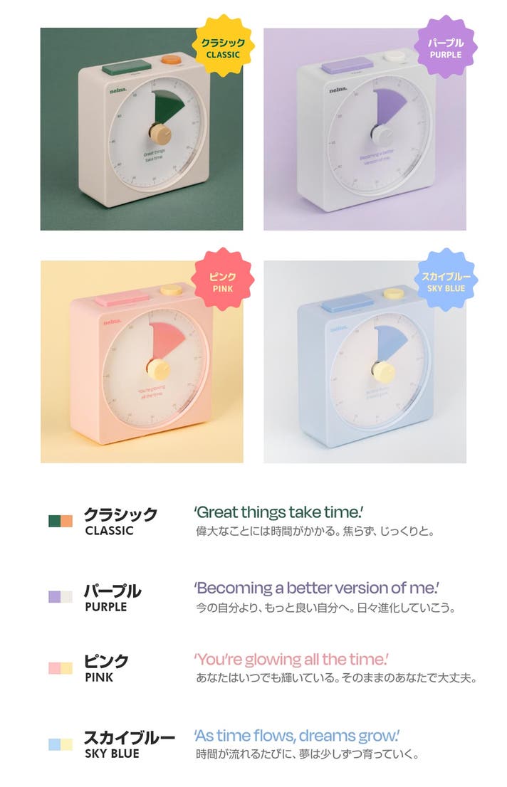 Focus-On Timerのそれぞれのカラーには、時間とともに成長するあなたを励ますメッセージが込められています。
