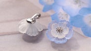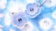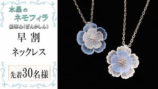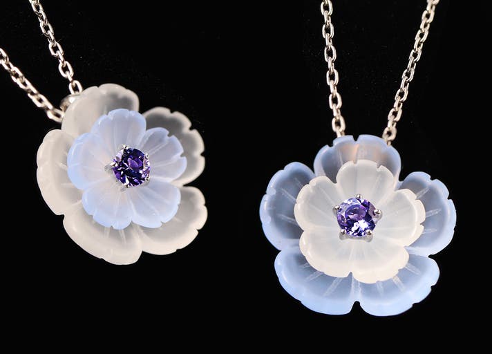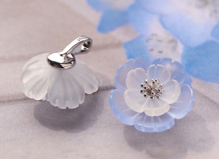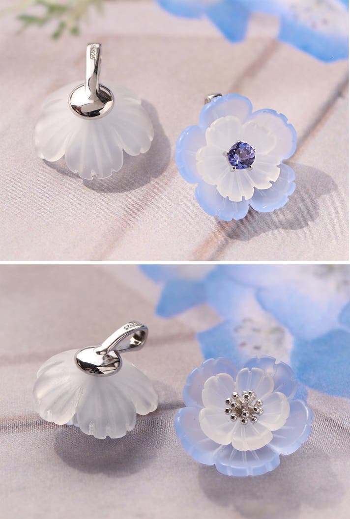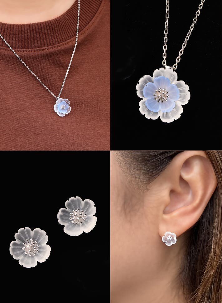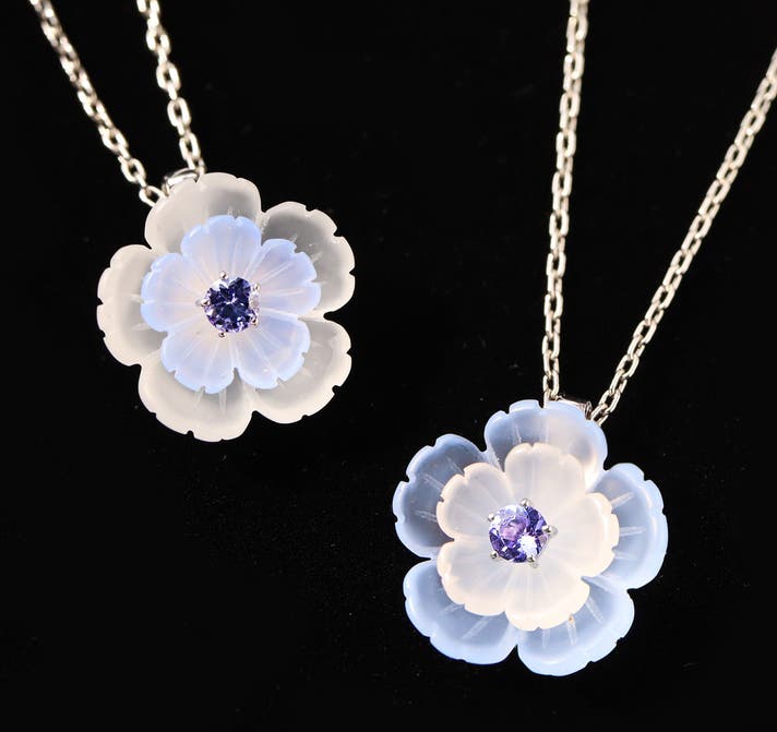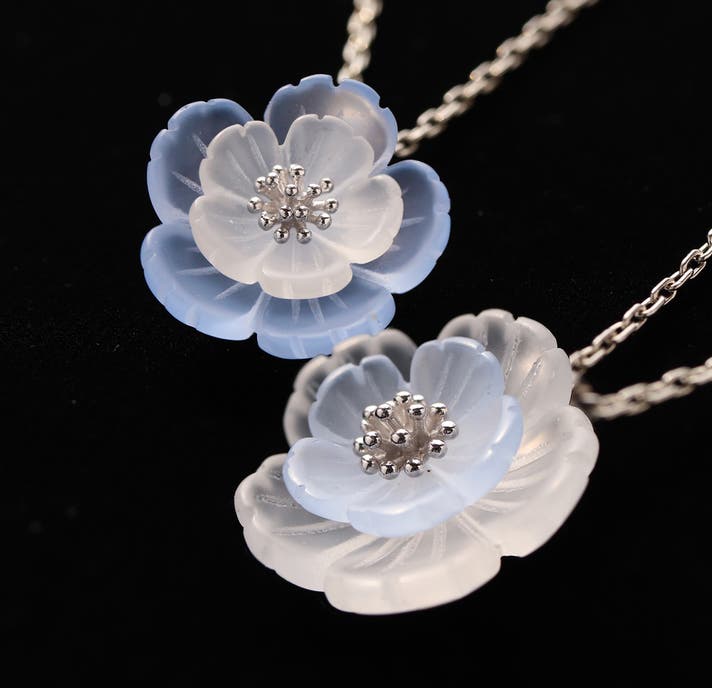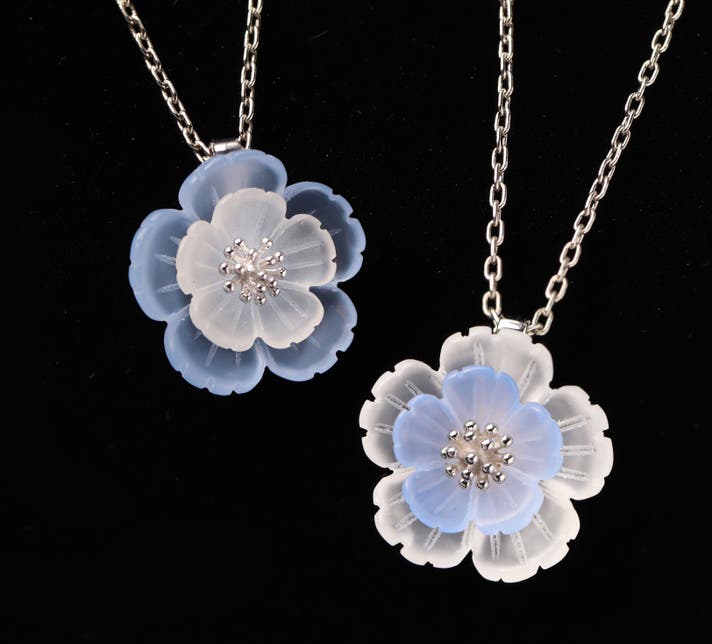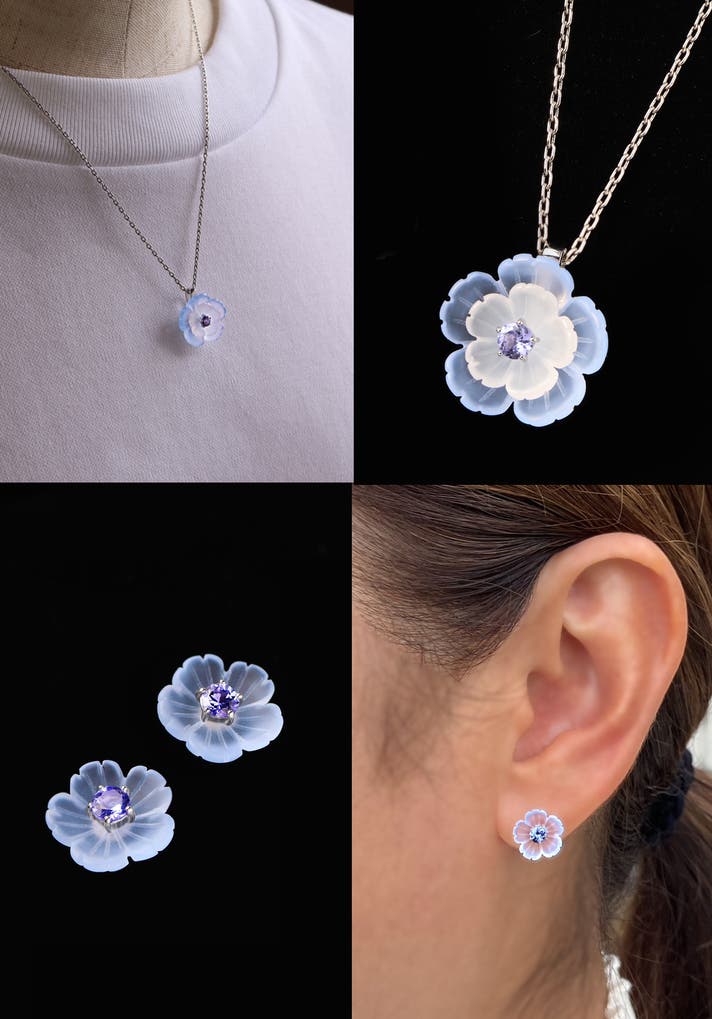 ペンダントは透明な水晶と淡い青色の水晶の2枚を重ね合わせ、ネモフィラの花が持つ、繊細なグラデーションと奥行きを表現しています。