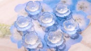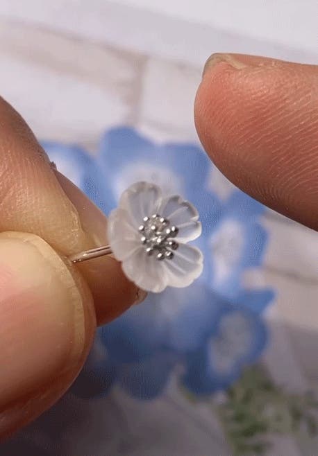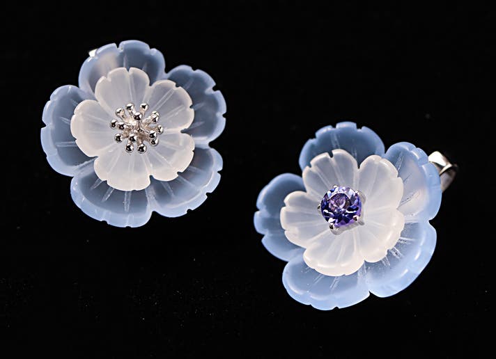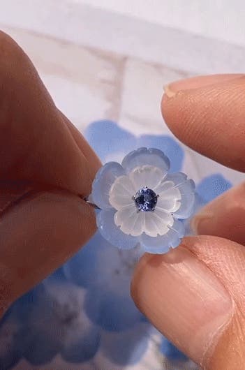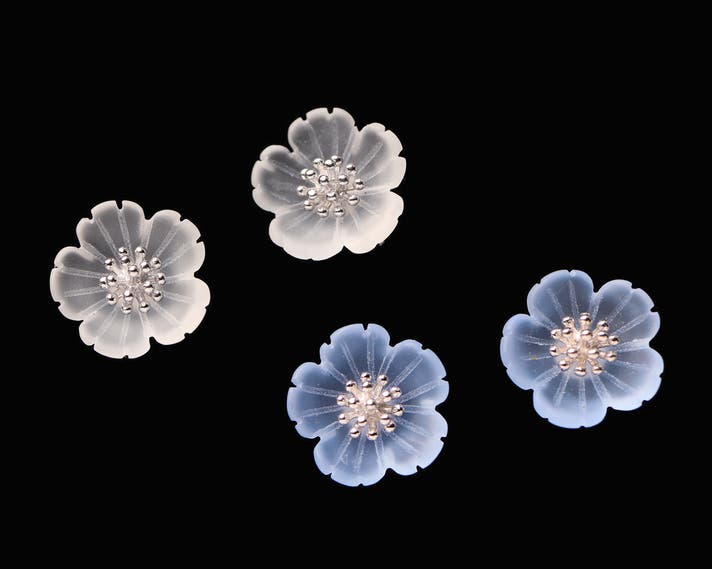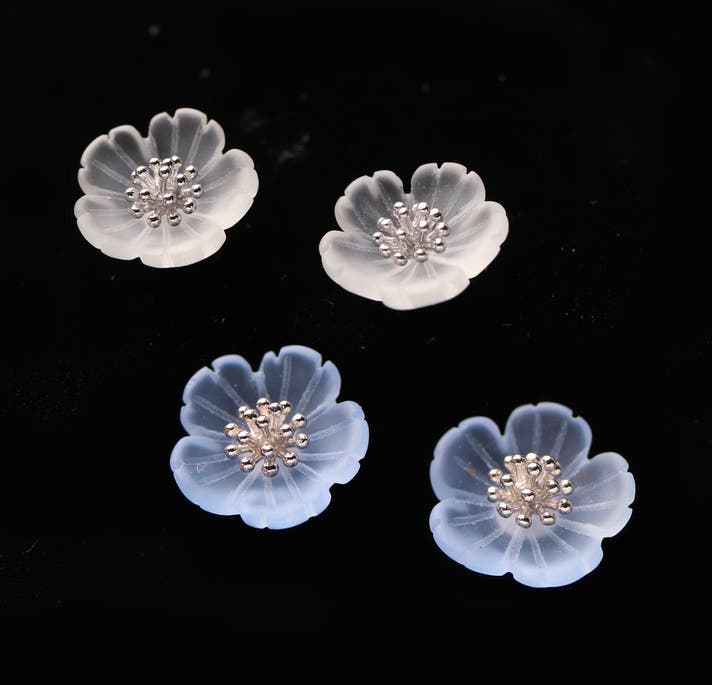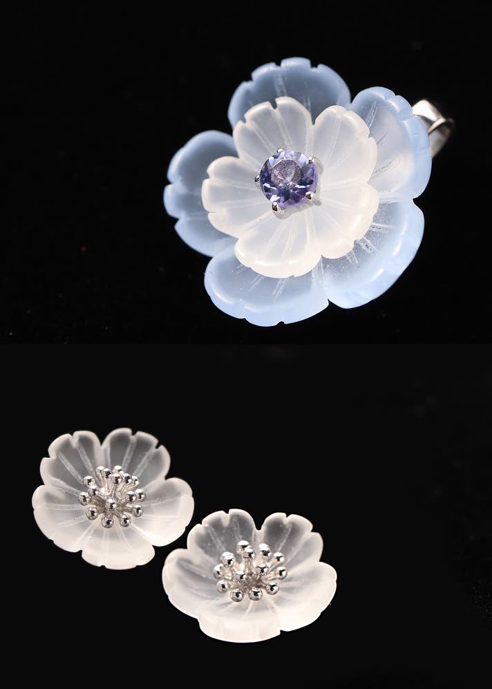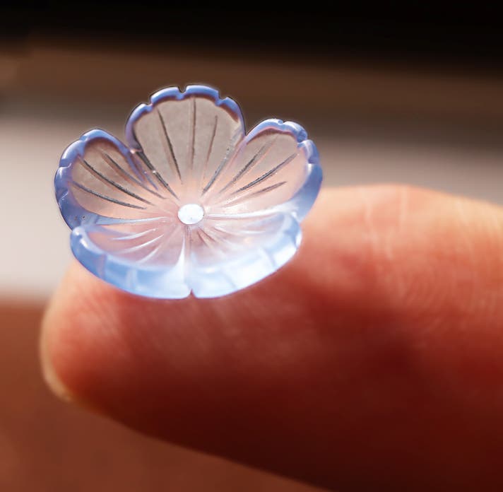 厚さ5mmの水晶の原石チップから、ネモフィラの花びらを削り出して作られています。