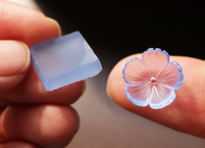 加工前の四角い原石と、丁寧に膨らみを付けた花びらのパーツを比較しており、その繊細な技術がよくわかります。