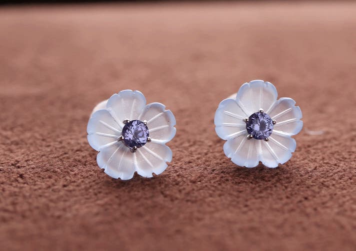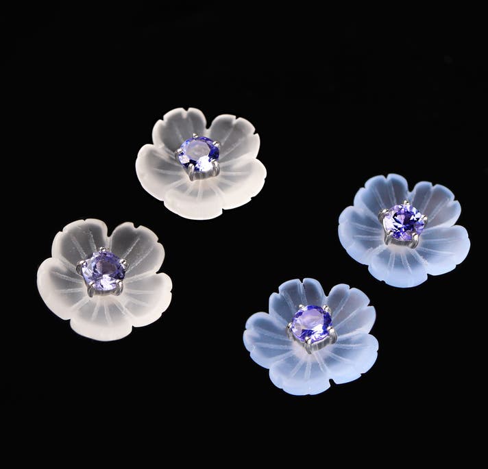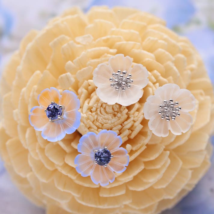 タンザナイトの青と紫が混じり合う独特の色合いが、淡いブルーのネモフィラの花びらに深みを与えています。