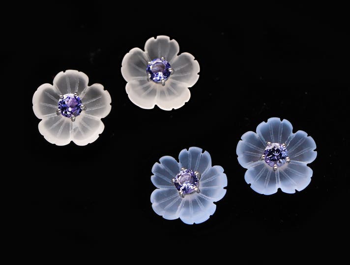 タンザナイトをあしらった「瑠璃華心」。青と紫が混じり合う独特の色合いが、耳元で繊細に煌めきます。