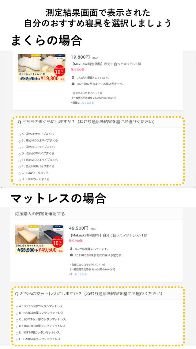 ※3 分析結果画面のページをすぐに削除しないでください。まくら、マットレスの応援購入はご自身の分析結果を参考にしながらお選びいただきます。