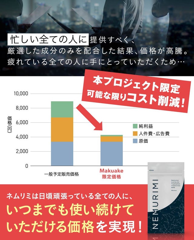 ネムリミに配合した成分はとても魅力あるものですが、その価格が高いことが問題で一部の富裕層しか手に取れないのが現実でした。