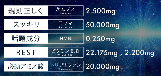 - 『ネムノス』『ラフマ』『NMN』『ビタミンB,D』配合。厳選した充実成分があなたをサポート