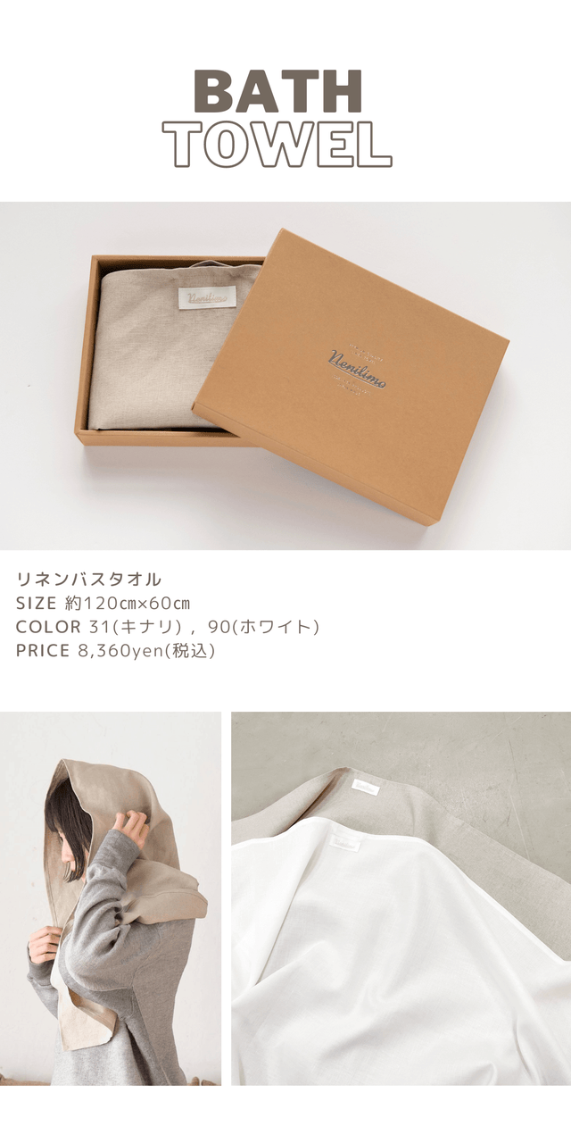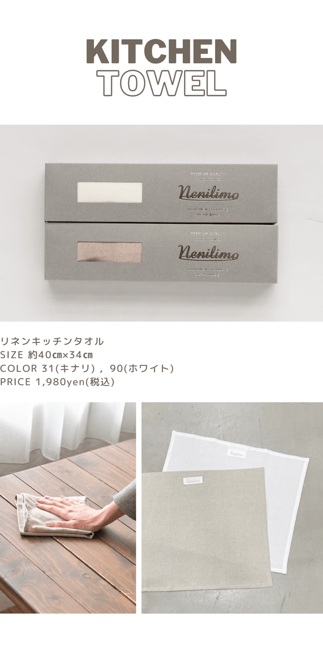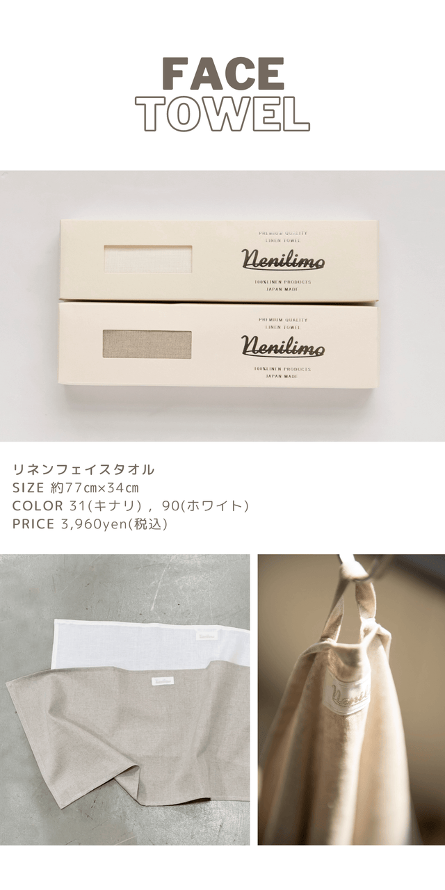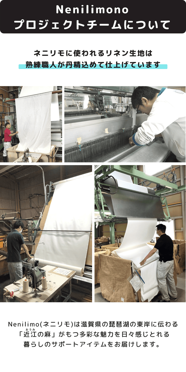 日本古来より伝わる麻織物の魅力にもとても感銘を受けましたが、その時にお土産に戴いた「麻布のバスタオル」を何気なく使用しているうちに虜になってしまい、家にあるタオルを全部コレにしたい!と思ったのがきっかけとなり、即商品化しなければ!と開発を進めてNenilimo(ネニリモ)は誕生しました。