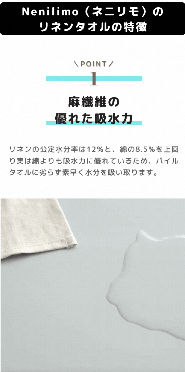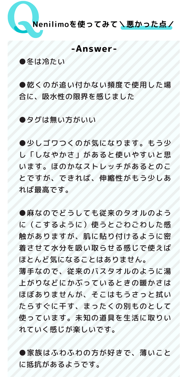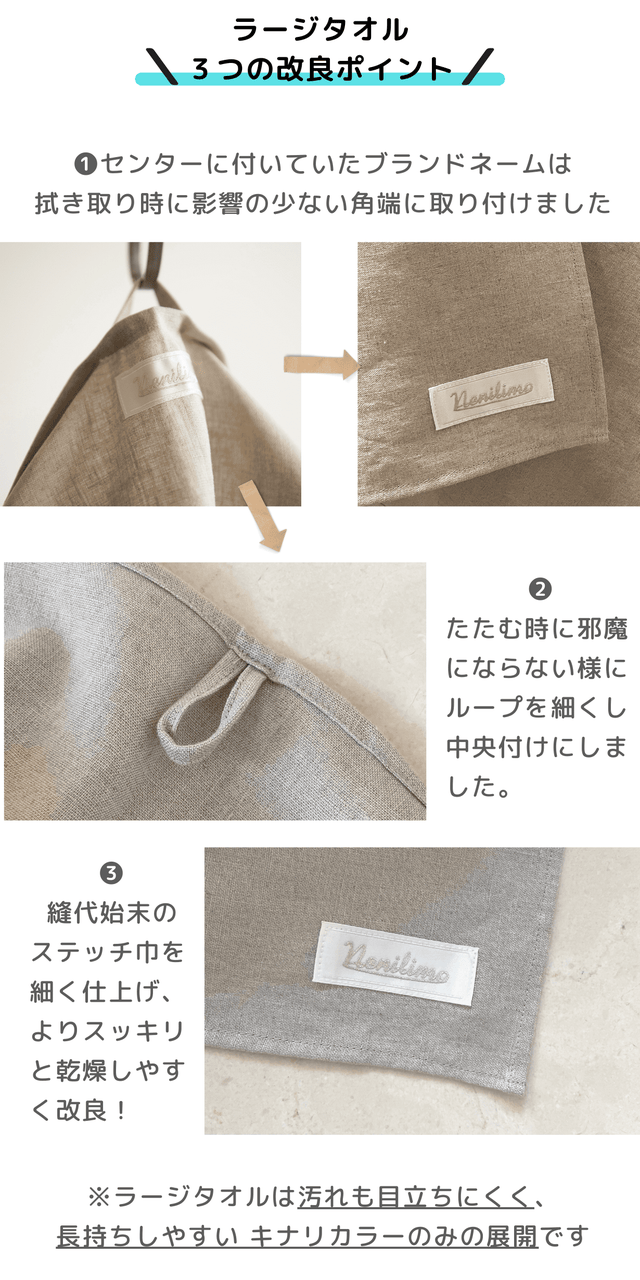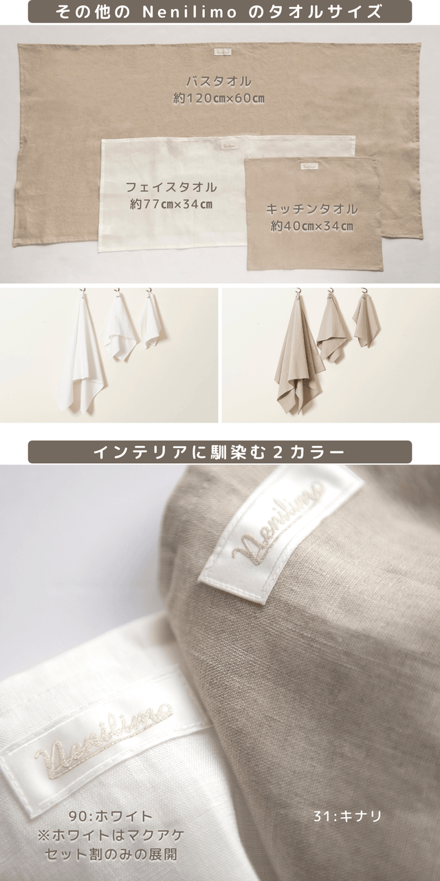 日本古来より伝わる麻織物の魅力にもとても感銘を受けましたが、その時にお土産に戴いた「麻布のバスタオル」を何気なく使用しているうちに虜になってしまい、家にあるタオルを全部コレにしたい!と思ったのがきっかけとなり、即商品化しなければ!と開発を進めてNenilimo(ネニリモ)は誕生しました。