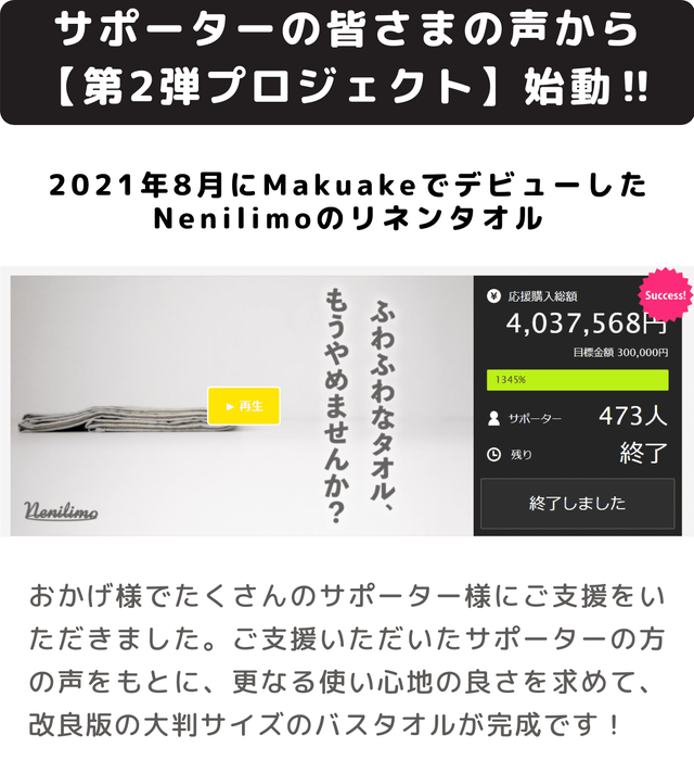 「Makuake(マクアケ)」は、実行者の想いを応援購入によって実現するアタラシイものやサービスのプラットフォームです。このページは、 プロダクトカテゴリの 「【好評第2弾】よく吸って、乾いて、臭いにくい!新感覚のタオルが大きくなって再登場」プロジェクト詳細ページです。