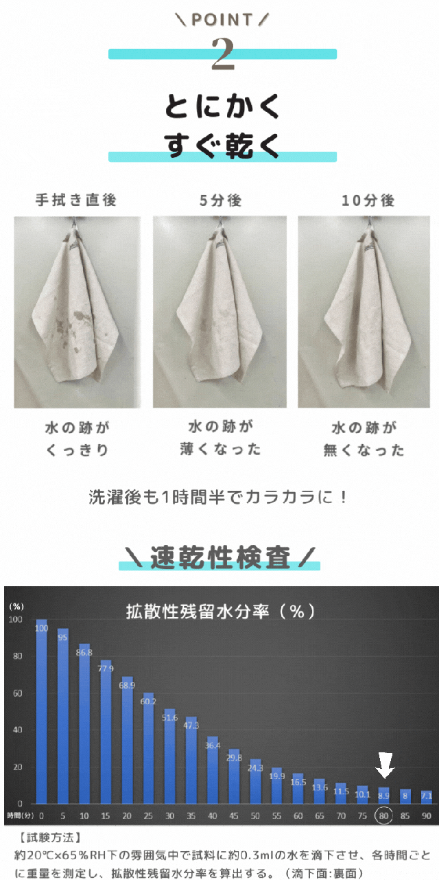 - 「速乾・抗菌・吸水・耐久・伸縮」パイルタオルを陵駕する新感覚タオル!