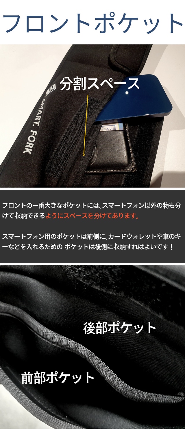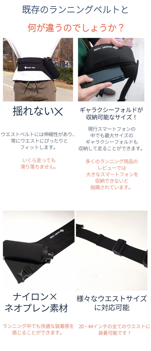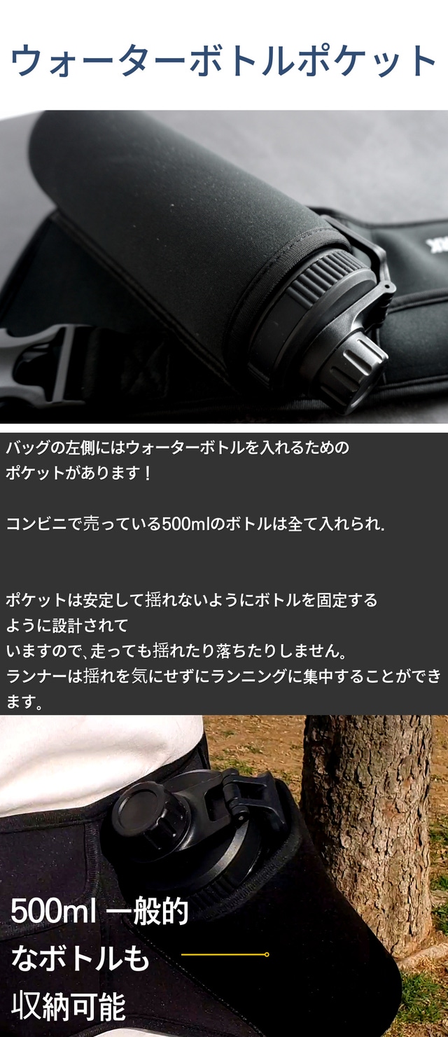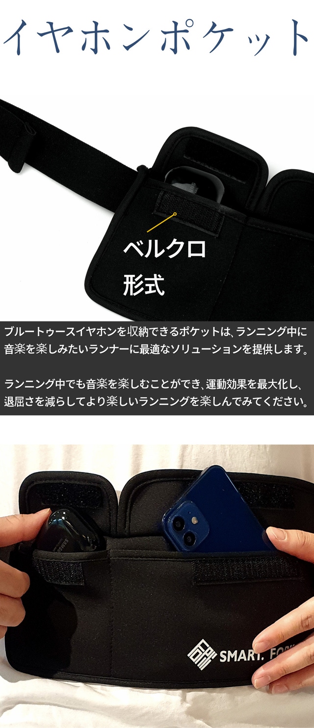 "水筒、スマートフォン、イヤホン、財布、タバコ。ランニング中に全てを携行するのは全く問題ありません。ポケットがぶらつく心配はこれで終わりです!