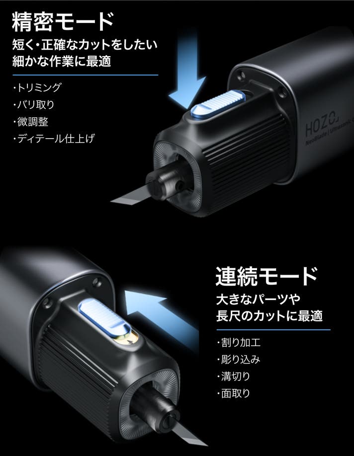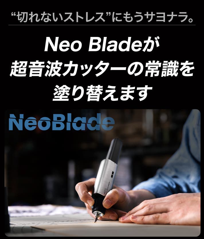 NeoBladeは、そんなHOZO DESIGNが機能性・安全性・携帯性・美しさすべてを追求して開発した、まったく新しい“コードレス超音波カッター”です。