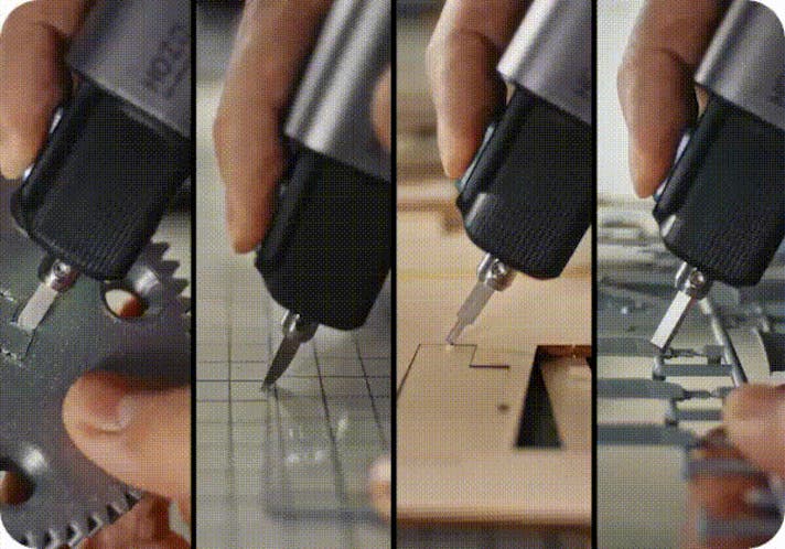 ストレート・カーブ・チゼル(ノミ型)・細刃など、素材や形状に応じて最適な刃を自由に切り替えることが可能です。