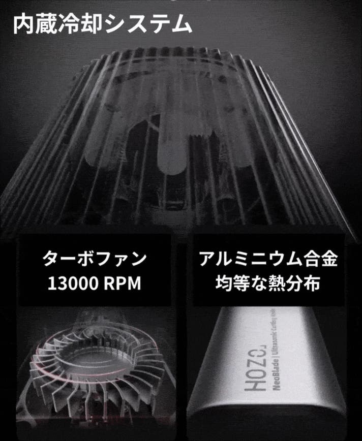 13000rpmのターボファンとアルミ合金ボディでNeoBladeは本体を効率的に冷却します。側面の通気口から空気が出入りするため、刃は常に冷たく、手も快適です。