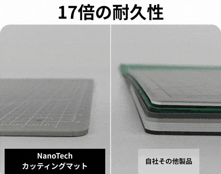 専用開発された「NanoTech Cutting Mat」なら、一般的な3層構造のカッティングマットに比べて17倍の耐久性を実現。超音波振動にも耐える独自構造で長く使えてデスクも刃も守れる優れものです。