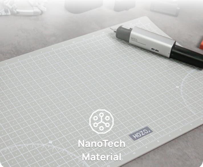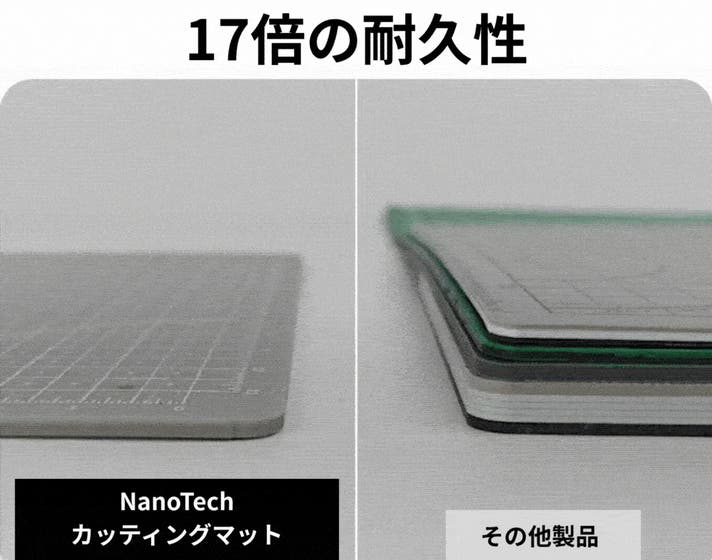 専用開発された「NanoTech Cutting Mat」なら、一般的な3層構造のカッティングマットに比べて17倍の耐久性を実現。超音波振動にも耐える独自構造で長く使えてデスクも刃も守れる優れものです。