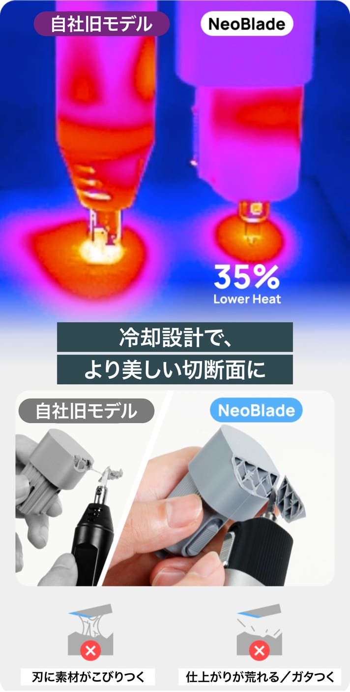 刃の発熱を抑えることで、バリや白化の原因となる熱変形を軽減。熱画像比較でも、他製品と比べて最大35%の低温を実現しています。
